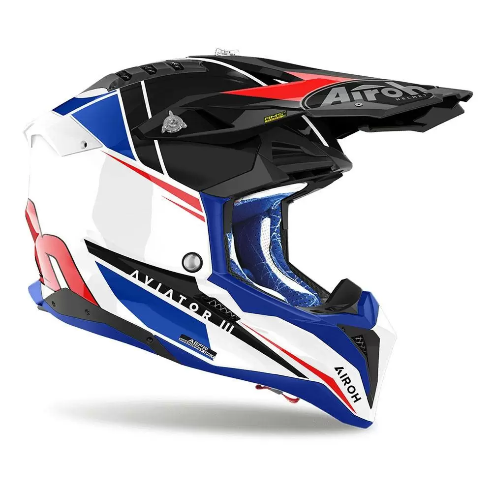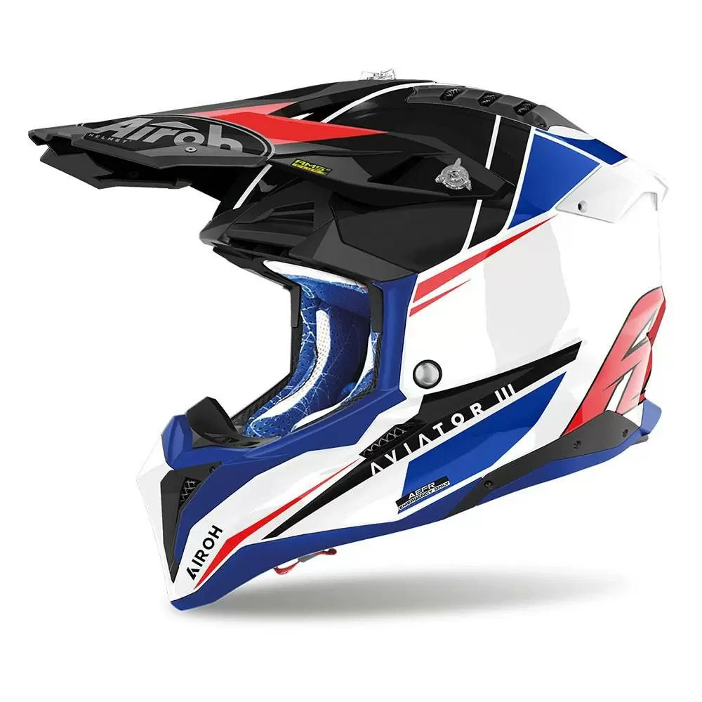 Airoh Aviator 3 Helmet in Push Blue Red Gloss. The New 2023 Airoh Aviator 3 AMS² Plus helmet raises the level of competition and redefines the standards of an off-road helmet. The shell, available in the Carbon 3K version exclusively on the Primal graphic, provides the noble HPC Carbon for the other graphics variants.