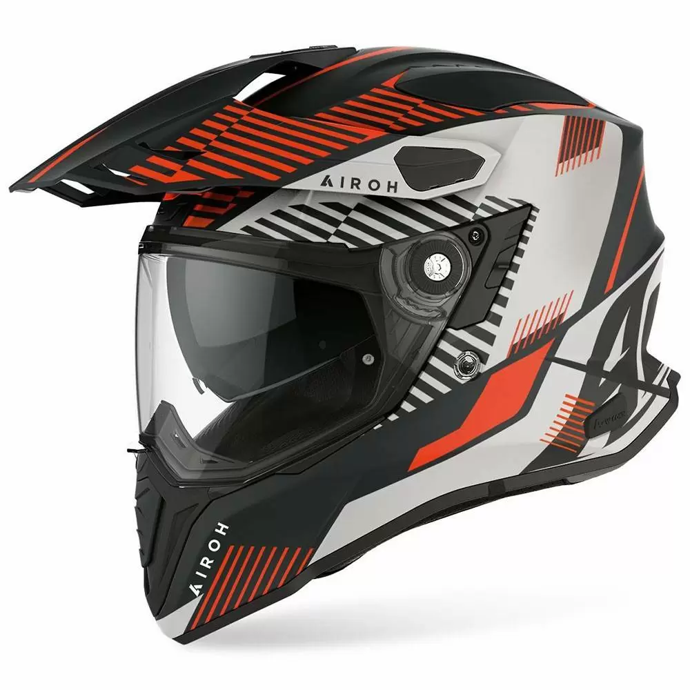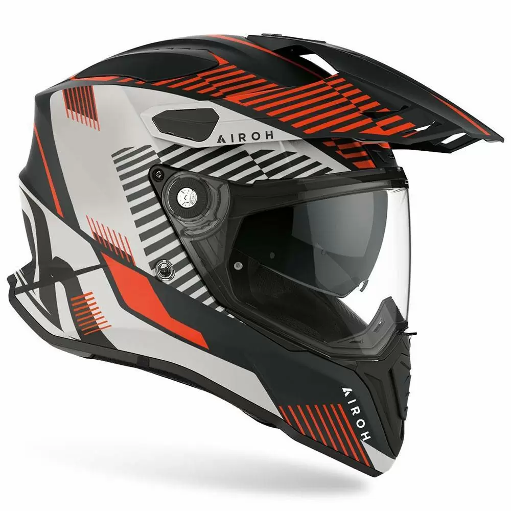 Airoh Commander Boost Orange Matt Adventure Helmet. Master and Commander Choose your route, The Airoh Commander dual sport Adventure helmet will adapt to any scenario. Its innovative design lets you easily change its nature, passing from the peak and visor combination for use on any terrain, to the naked mode without peak and with the visor for road speed.