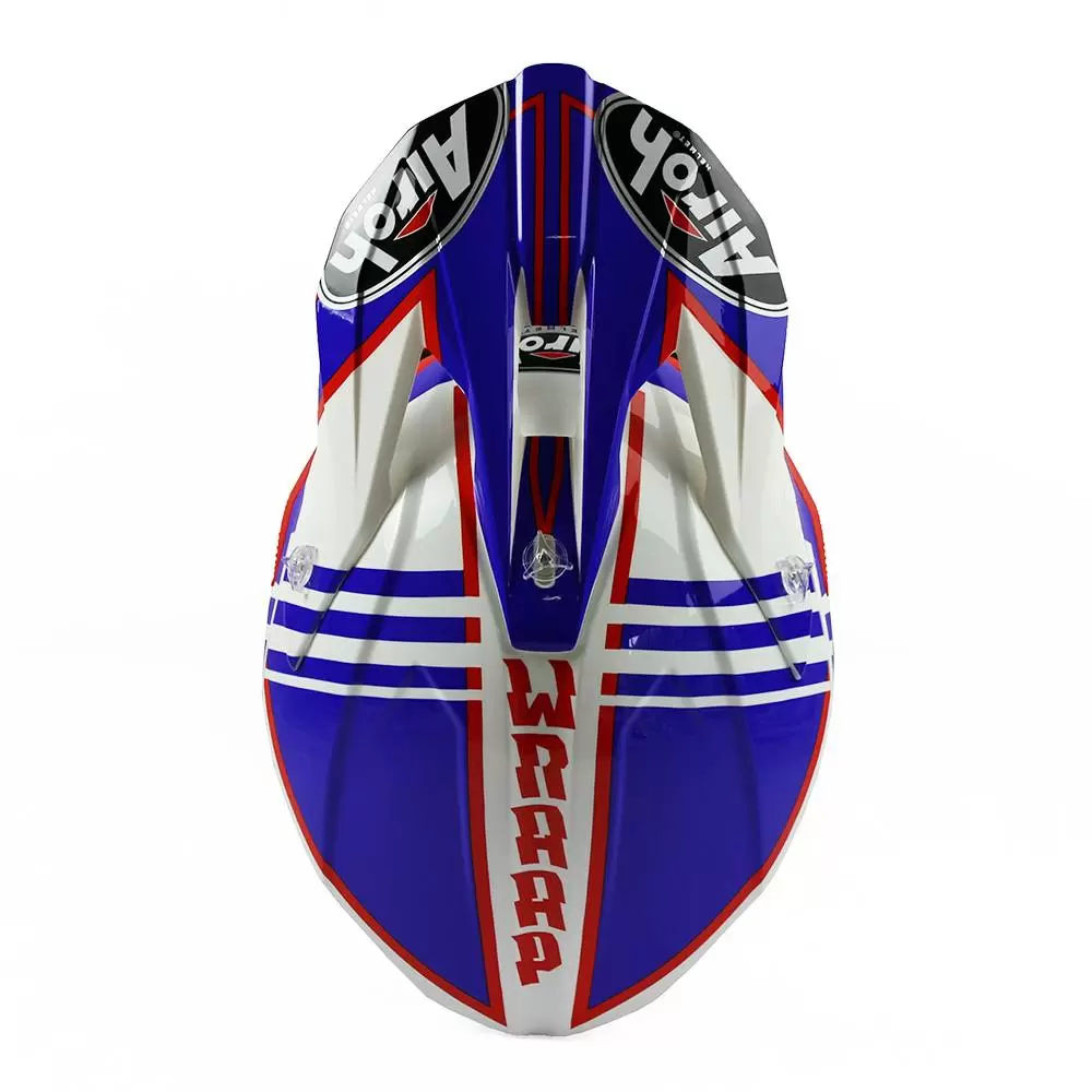 Airoh Wraap Broken Blue Red Gloss Helmet. WRAAP: The passion for the off-road has no age limits and the new Airoh helmet wants to be the best way to bring young people closer to this world. Ultralight shell in HRT (High Resistant Thermoplastic) with three different sizes to dress all sizes.