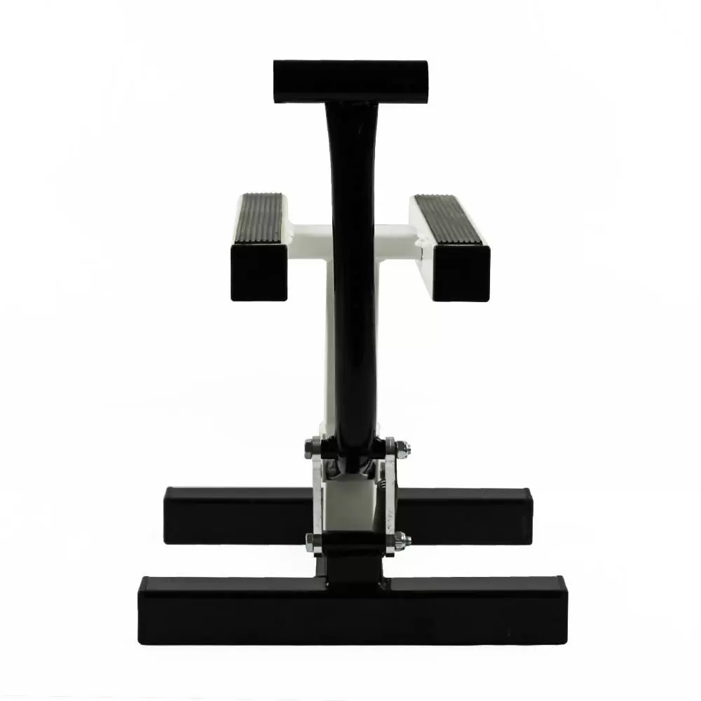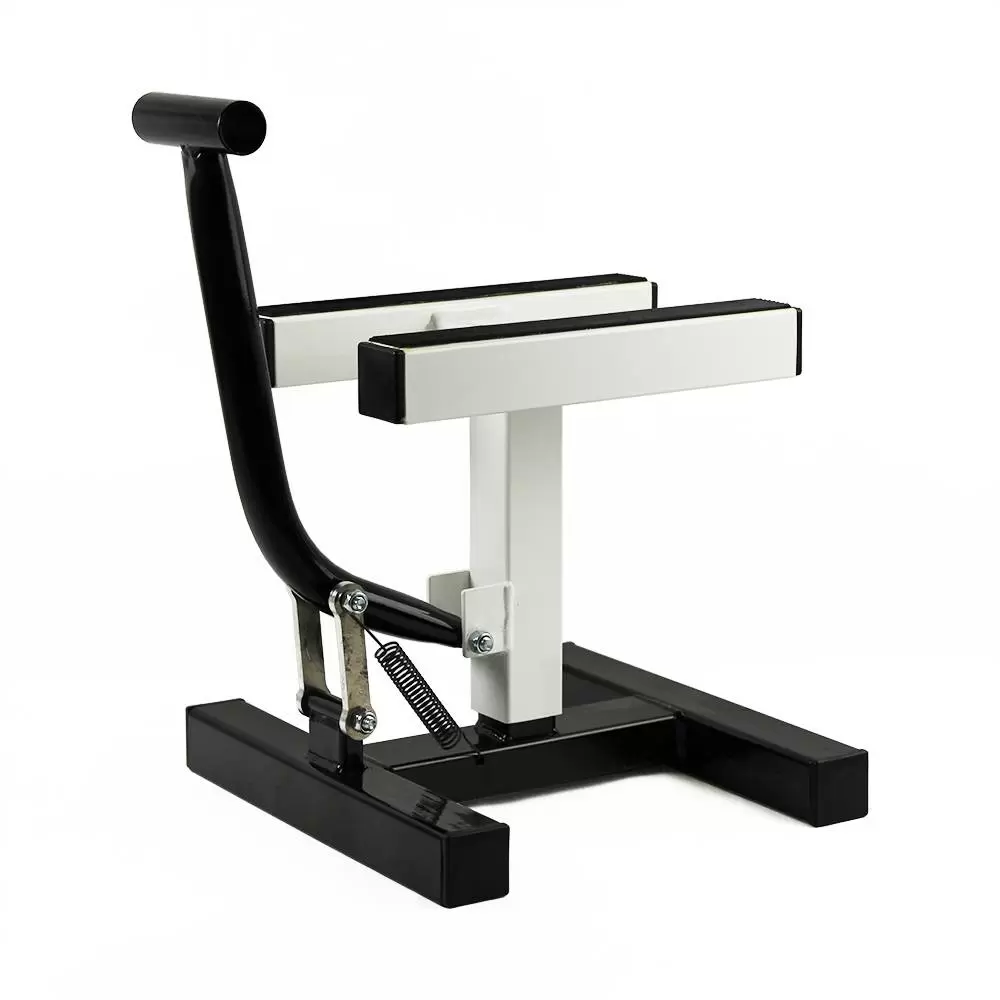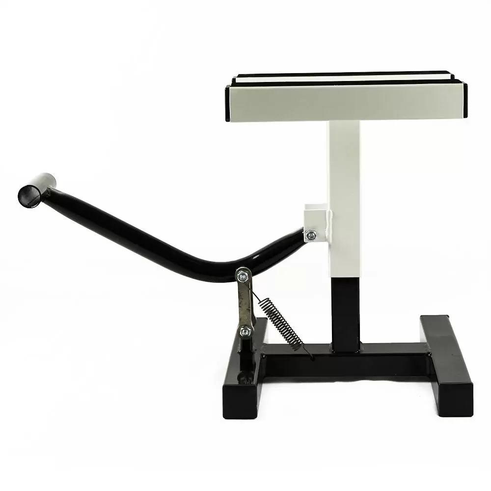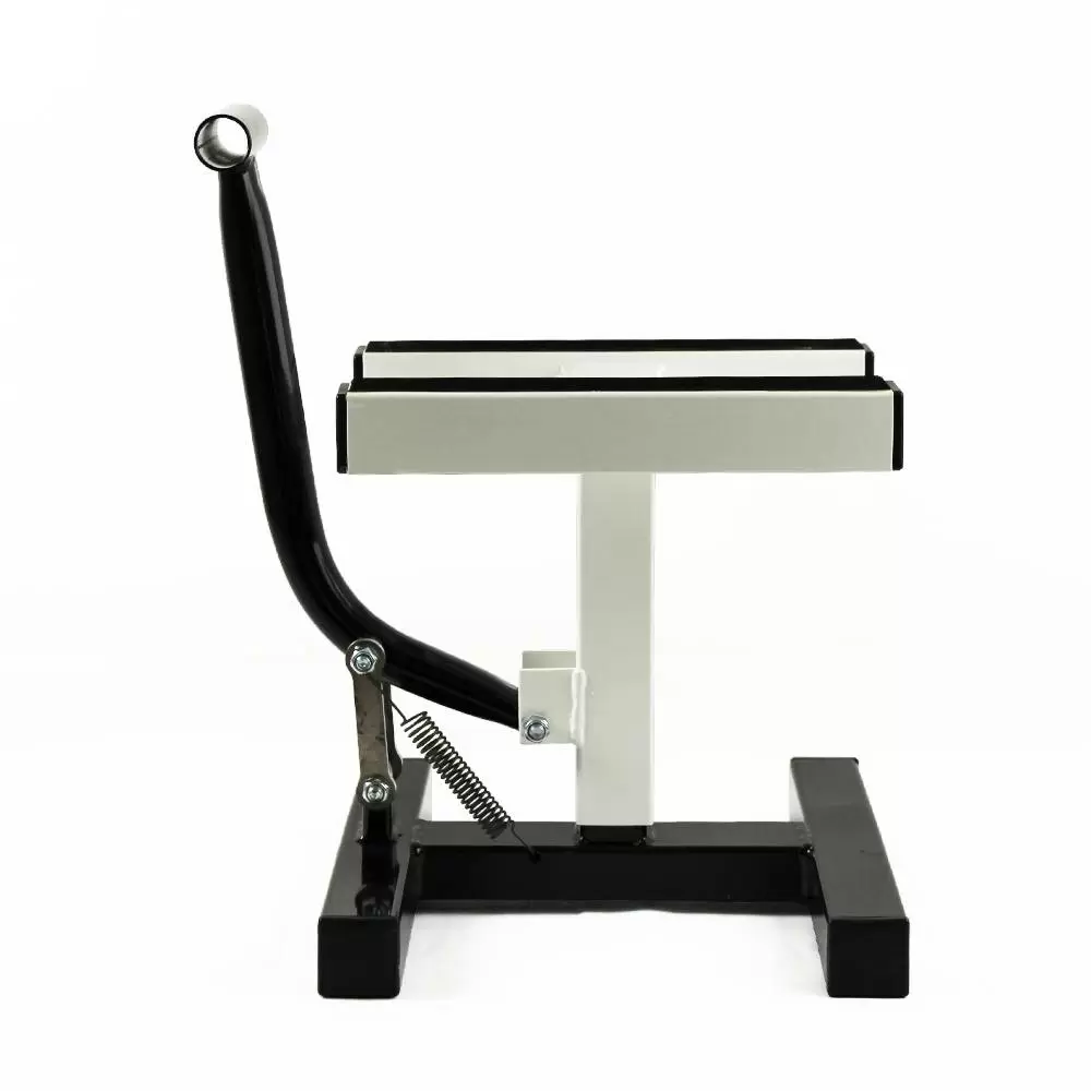 MDR Heavy Duty Single Pillar mechanic white bike stand. Stand lifts both wheels of the bike off the ground when in raised position, and easily lowers by utilizing the attached foot pedal. This heavy duty bike stand is a solid, easy to use dirt bike stand suitable for riders of any level.