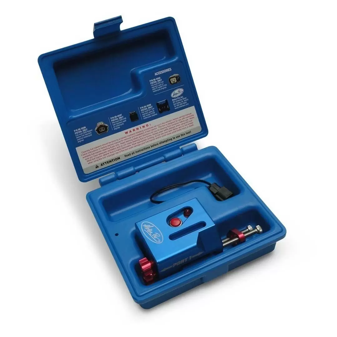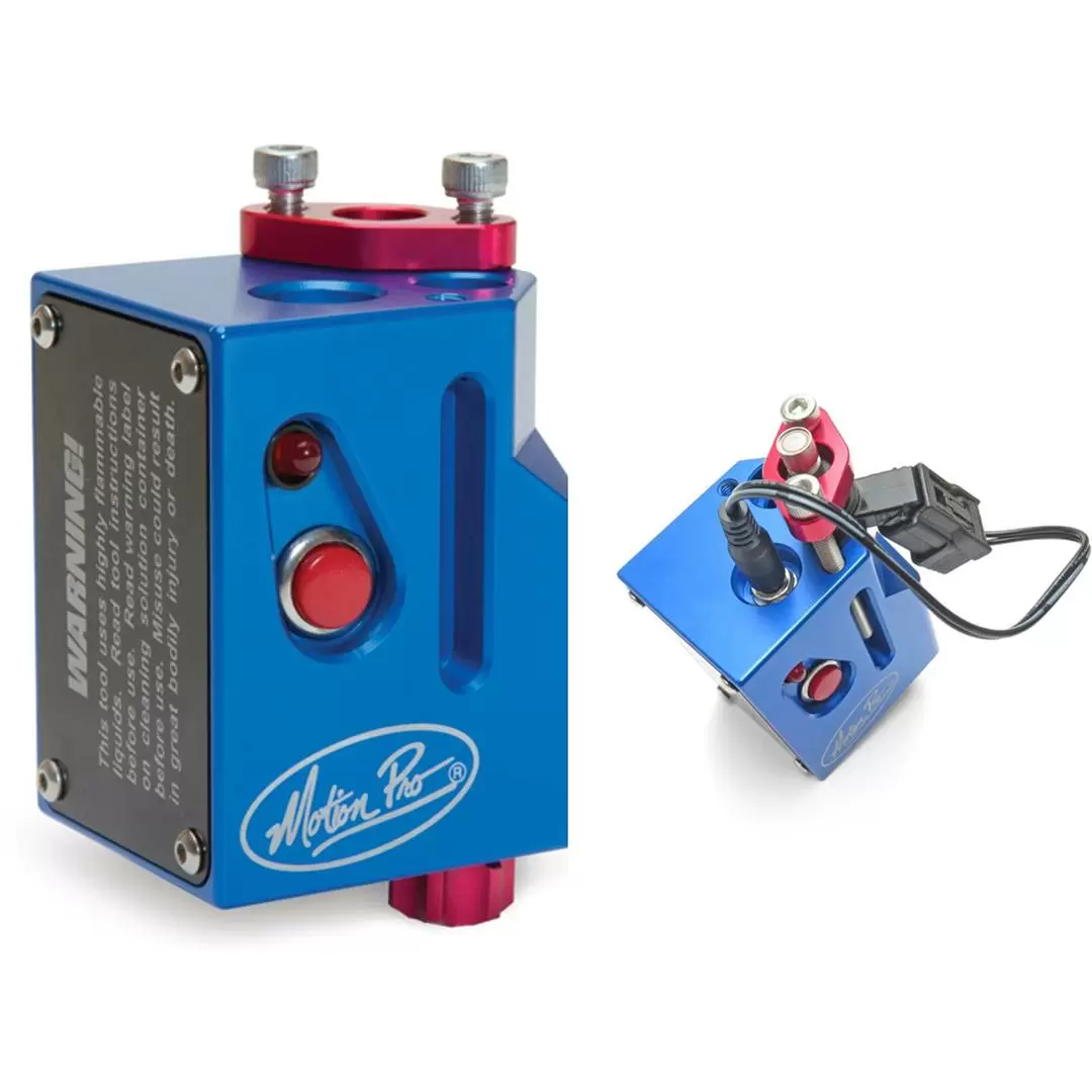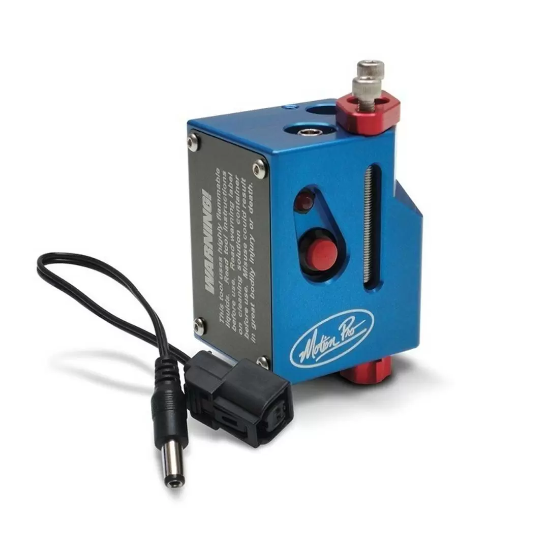 Fuel Injector Cleaner Kit by Motion Pro®. Easily cleans most fuel injectors. Will flush and back flush injectors for best possible cleaning process. No compressed air required. Requires aerosol can of fuel injection cleaner, not included. Push button switch to turn fuel injector on with LED battery condition indicator light. Durable anodized billet aluminum construction.
