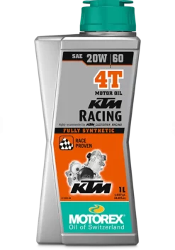 Motorex KTM RACING 4T SAE 20W/60 has been developed for four-stroke, high-tech motorbikes in collaboration with KTM and guarantees optimum protection for engines under the toughest conditions. In addition, it enables the precise switching of gears as well as the optimum functioning of wet multi-disc clutches.