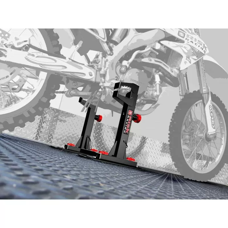 The Junior “Lock-N-Load” Moto Transport System securely holds your motocross bike in your trailer without the use of tie-down straps, floor anchors or wheel chocks. It takes an enormous amount of pressure off of the fork seals during transit, and it frees up valuable space allowing the transport of more motorcycles or gear.