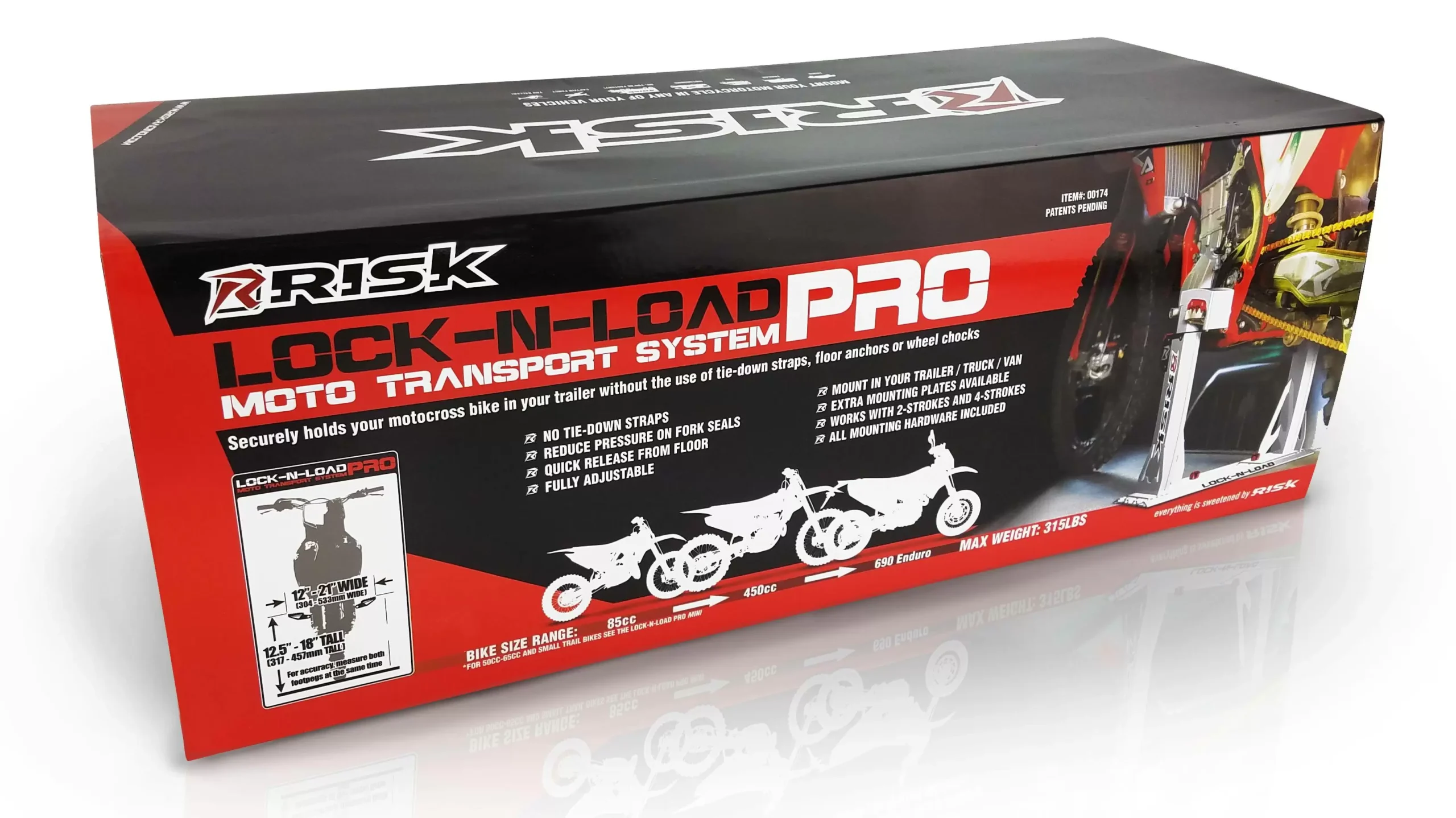 Risk Racing is proud to introduce the new Lock-N-Load PRO and PRO Mini Moto Transport Systems. The PRO systems are fully adjustable in both width and height. This adjustability combo creates the opportunity to capture a much broader range of bikes. Users simply set the appropriate width and then roll the bike into the system and press down on the ratcheting jaws until the bike is secure. The new PRO systems know few limits and can haul numerous bikes from a Cobra 50cc to a KTM 690 Enduro!
