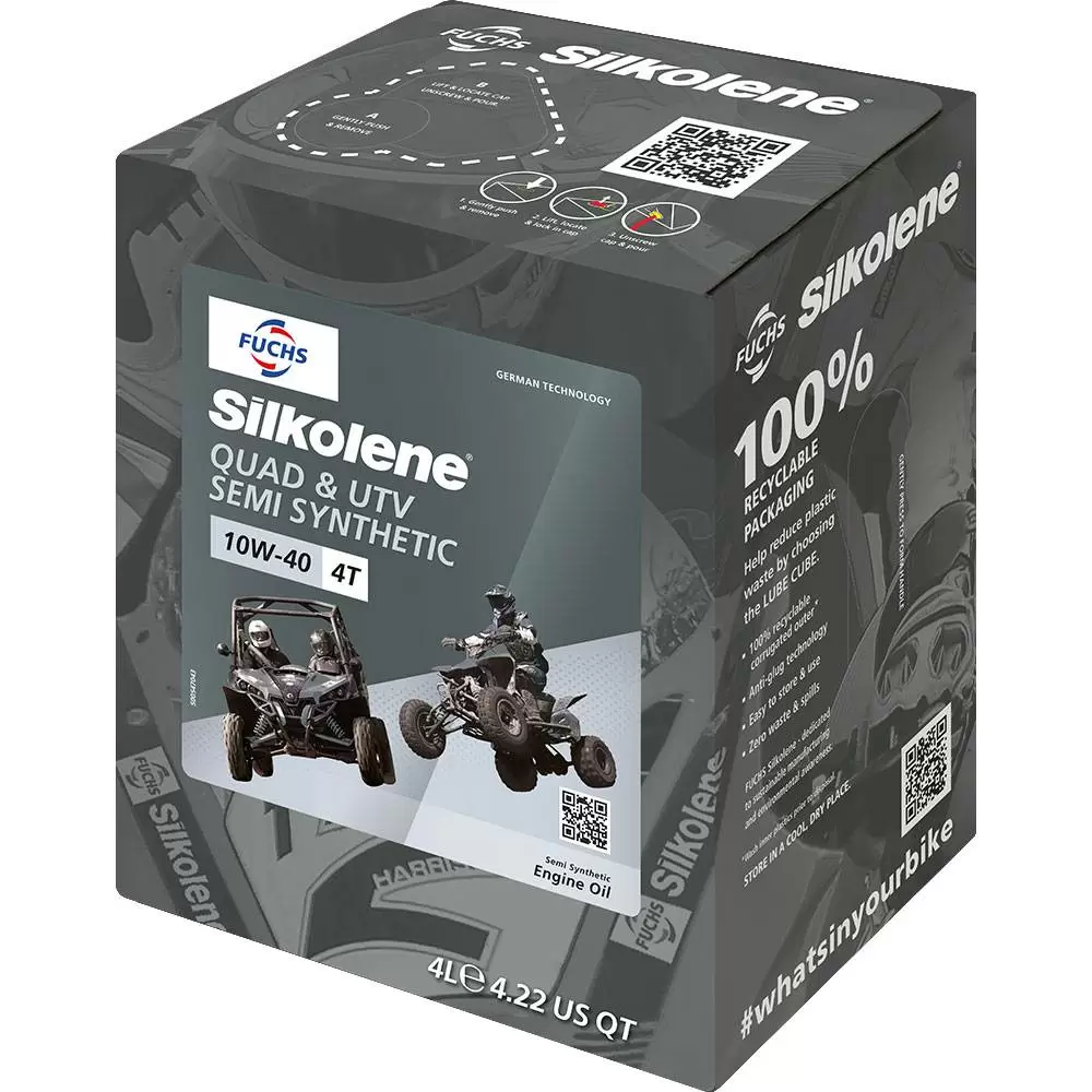 ATV/Quad 4T SAE 10W-40 Semi-Synthetic Engine Oil, 4L Lube Cube by Silkolene. Modern semi-synthetic quality engine oil for 4-Stroke ATV/Quads offers excellent wear protection, very good cold start characteristics, and high shear stability. Catalytic converter tested.